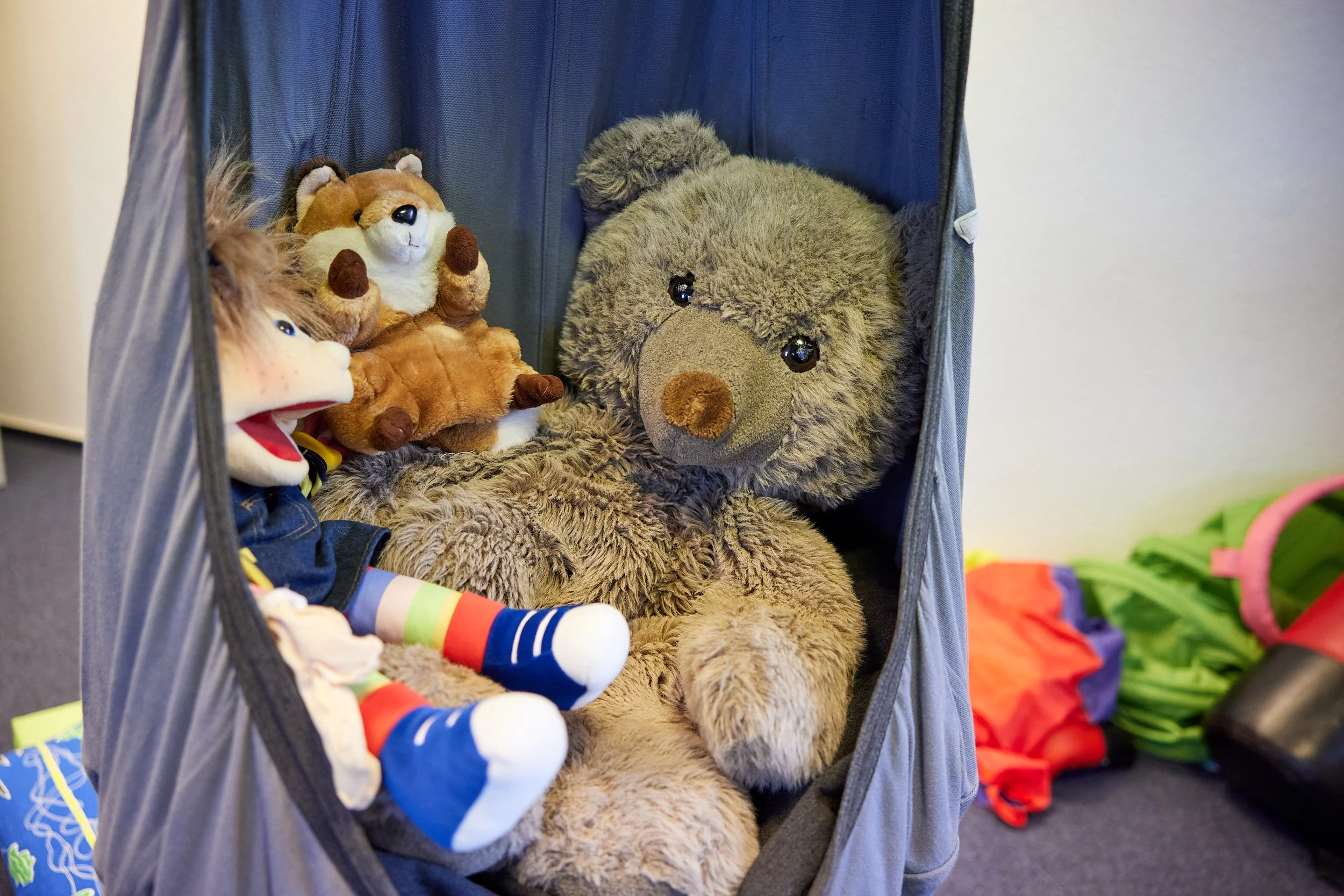 Eine angehörige Person begleitet das Kind zur Kindergruppe und bleibt während der gesamten Gruppenzeit in einem separaten, geschützen Raum. Moderiert wird diese Angehörigengruppe von geschulten, ehrenamtlichen Mitarbeiter:innen.